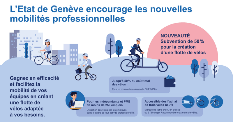 Dans le cadre de sa politique de promotion des mobilités durables, l’État de Genève met en place plusieurs dispositifs des soutien destinés aux entreprises, aux indépendants ainsi qu’aux PME de moins de 250 collaborateurs. Ces aides visent à encourager l’adoption de solutions de déplacement plus efficaces et respectueuses de l’environnement dans le cadre des activités professionnelles.