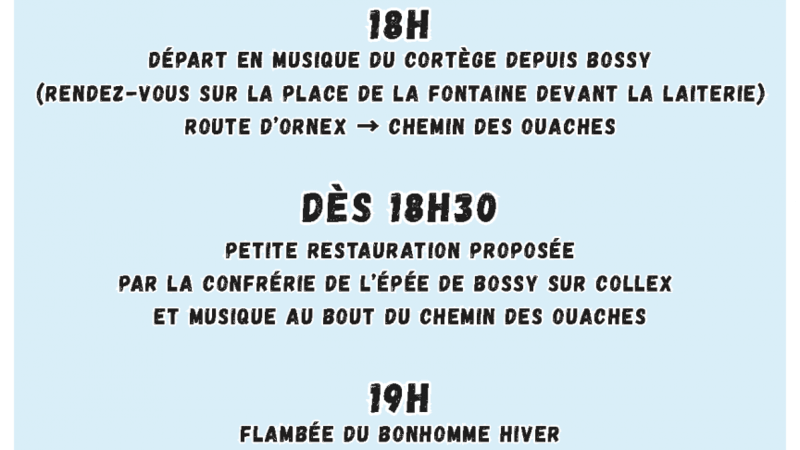 Dès 18h30, la Confrérie de l’Épée de Bossy sur Collex nous attendra au bout du chemin des Ouaches avec une petite restauration à la vente.